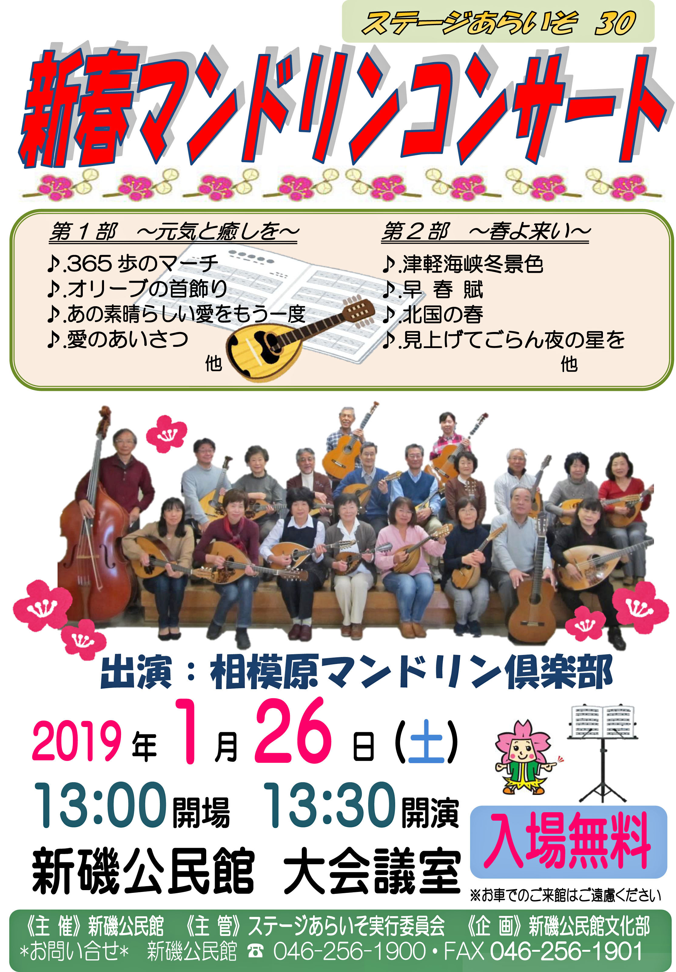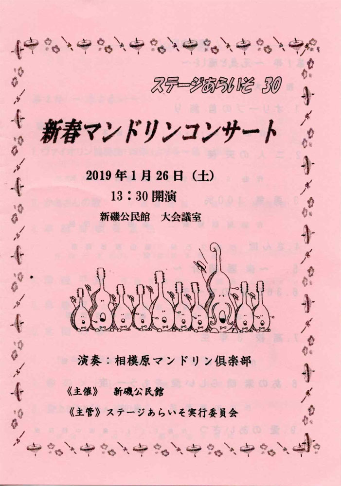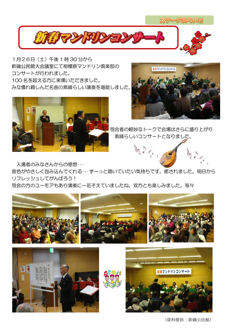さる1月26日、相模原市新磯公民館において「新春マンドリンコンサート」が行われ、司会、指揮者を含め総勢48名が